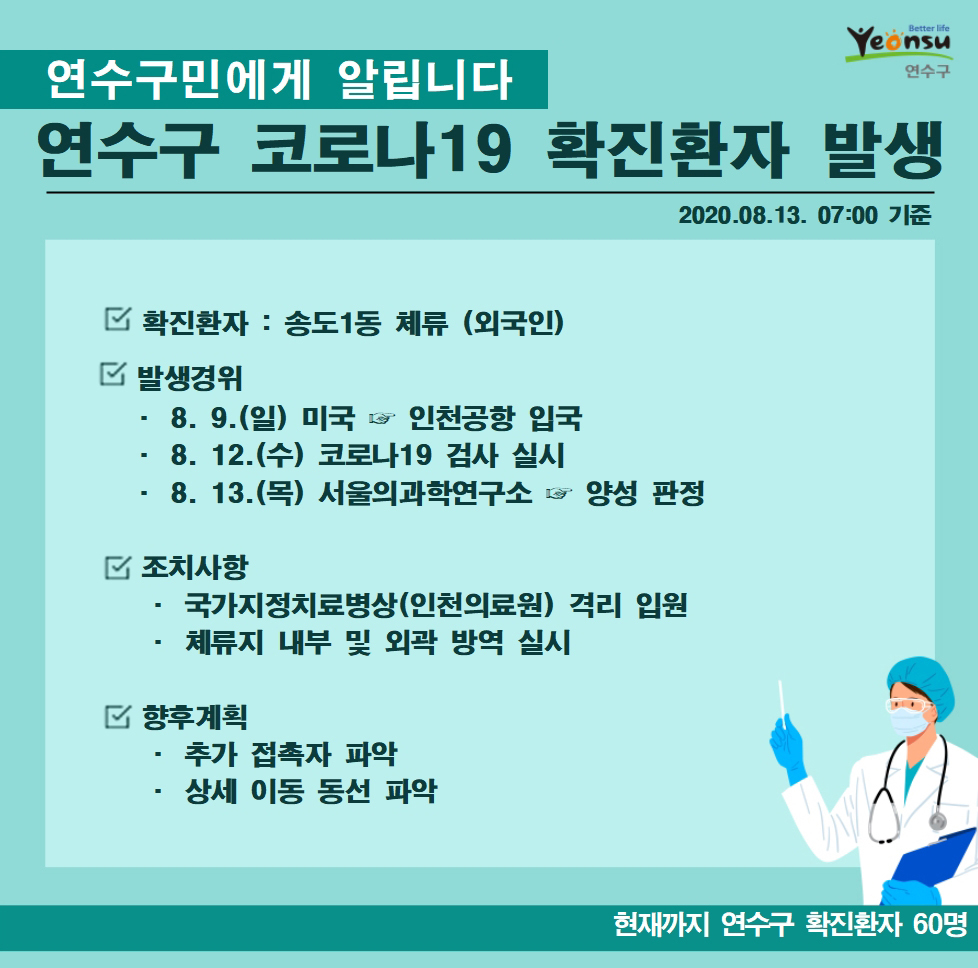 | 인천 연수구 송도1동 호텔서 체류하던 외국인 코로나19 확진 - 인천일보 Posted: 12 Aug 2020 07:17 PM PDT tinggalaja.blogspot.com ![]() 인천 연수구 송도1동에 체류 중인 외국인이 코로나19 확진 판정을 받았다. 연수구는 미국 국적 A(61)씨가 코로나19 검사 결과 양성 판정을 받았다고 13일 밝혔다. A씨는 항공사 승무원으로 이달 9일 미국에서 인천국제공항으로 입국했다. 이후 11일 발열과 근육통 등 증상이 나타나 출국을 연기했고 12일 나사렛병원 선별진료소에서 검체 검사를 받았다. A씨는 이날 양성 판정을 받고 인천의료원으로 옮겨졌다. 구 관계자는 "A씨가 머무른 연수구 송도1동 호텔 일대에서 방역을 하고 역학조사를 진행하고 있다"고 말했다. /박범준 기자 parkbj2@incheonilbo.com ▲ 인천일보, INCHEONILBO 저작권자 © 인천일보 무단전재 및 재배포 금지 August 13, 2020 at 07:18AM https://ift.tt/3aj8rAe 인천 연수구 송도1동 호텔서 체류하던 외국인 코로나19 확진 - 인천일보 https://ift.tt/2BPO8x6 | |